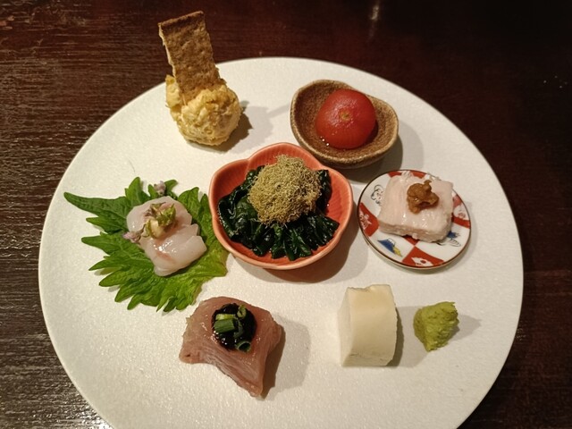 当店の名物を中心に、旬のお魚やお野菜が入るお料理構成となってます。 メインはお魚になります。 お味噌や発酵調味料をふんだんに使った名物と旬食材の逸品料理をお楽しみください。 スパークリング日本酒との相性も抜群です。