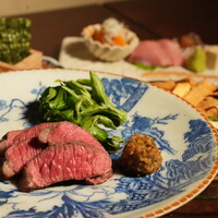 当店の名物を中心に、旬のお魚やお野菜が入るお料理構成となってます。 メインはお肉になります。 お味噌や発酵調味料をふんだんに使った名物と旬食材の逸品料理をお楽しみください。 スパークリング日本酒との相性も抜群です。