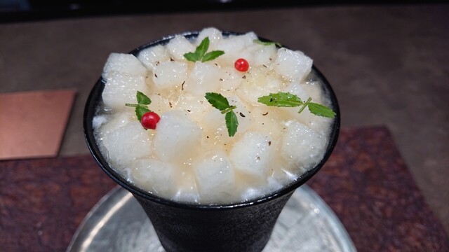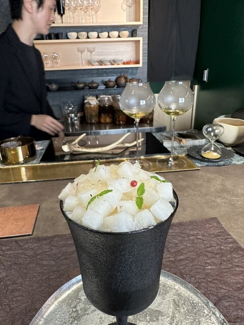 神楽坂の路地裏で、日本茶を軸に発酵を織り交ぜた「茶湊流水」をご提供しております。茶畑を訪れた時に感じた情景を落とし込み、旬のフルーツが持つポテンシャルを最大限に引き出した魅惑の一皿。オーナーシェフ田中が自身の感性を大切にし、「何を個体にして何を液体にするか」を考えながら、毎月のコース内容を決めております。無駄なものを削ぎ落したスタイリッシュな空間で、ゆっくりと愉しいひと時をお過ごしください。