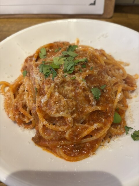 ランチタイムラストに汗だくで飛び込んで来て、あまりにも強い意志でボロネーゼに拘る女ひとり客が不思議だったのか、付け合わせも付けていただき、誠実なボロネーゼで充実のランチタイムを過ごすことが出来ました。