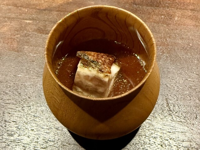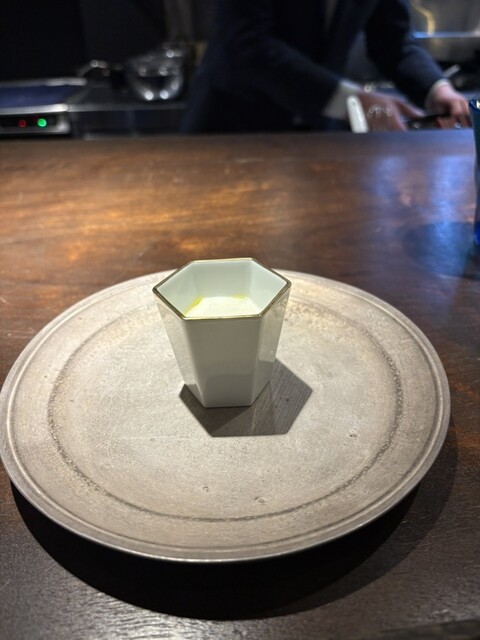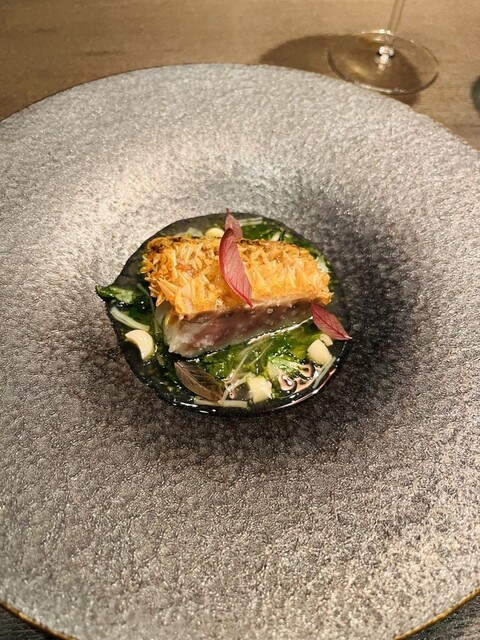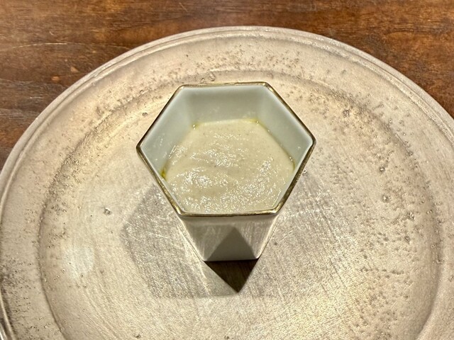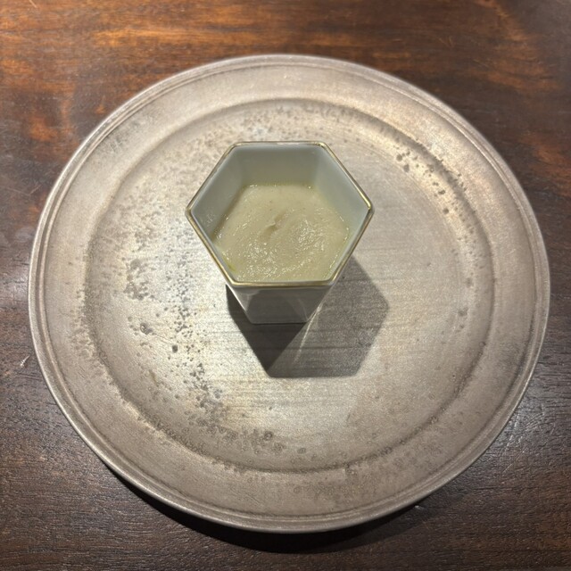 ここ数回続いていたお麩のフィンガーフードではなく、フォアグラのテリーヌに蕪のソース。スターターとしてフォアグラの濃厚さを押さえた優しい印象の一...