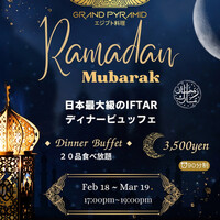 この特別なラマダン季節を共にお祝いしましょう! 2月18日〜3月19日限定のラマダンディナーブッフェを開催致します。20種類の多彩な料理をご用意しております。サラダ、前菜、スープ、ご飯、メインディッシュ、デザートを加えブッフェでのサービスドリンクも提供。料金は、お一人様3500円(90分制),ワンドリンク制となっております。*3歳〜10歳のお子様:2500円 ※別途サービス料10%が発生いたします。 ※予約可能時間は17:30〜19:00(90分制)L.O.19:00です。