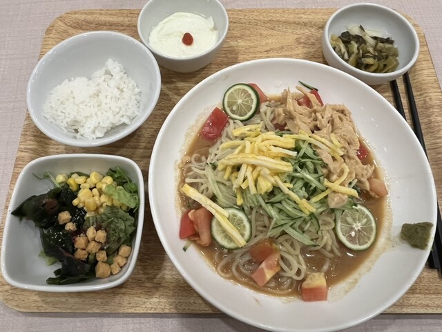 すだちが添えられていて非常にさっぱり。暑い夏にちょうど良い冷麺です。蒸し鶏自体にも濃厚なタレが絡められていて、味がしっかりとして美味しいです。ご飯とサラダはセルフサービスで取るスタイルです。ランチは全メニューが1,200円で明朗会計