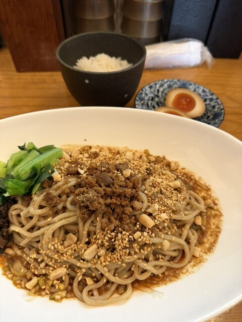 店内はカウンター10席程度。11時半入店でラスト1席。席はなかなか狭く、両脇のお客さんの腕がちょいちょいぶつかる程度。その後ら続々と待ちのお客さん。なんとか荷物を椅子の下に入れて着席。紙エプロンあるのは嬉しい。こんだけ狭いと無ければどんな悲劇が待ち受けている事か。看板メニューらしい汁なし担々麺を注文。先に味付け卵が別皿で到着。しばらくして担々麺到着。席が狭いのに器はまぁまぁデカい。の割には量は普通...