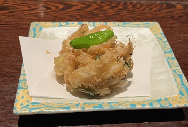 衣は薄く軽やかで、カラリと揚がっており、油っこさを感じさせない。塩も提供されるので付けて食べる。白海老の甘み、サクッとした衣との対比が心地よい食感である、小ぶりながらも海老の香りと旨味がぎゅっと詰まっており、素材の良さが感じられる。見た目以上に満足度が高く、軽やかなのに印象に残る、大人の酒肴であった。