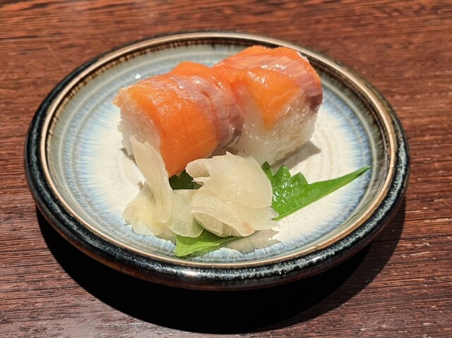 マス寿司である。押し寿司特有の程よい締まりがありつつも、酢飯はふっくらとしていてやわらかく、米本来の甘さを感じることができる。そこに重ねられたマスは、しっとりとした食感で、脂のりは程ほどで押し寿司によくある重さはなく、ちょうど良い大きさで、素材の良さが前面に出ている。すでに醤油で味付けされている。