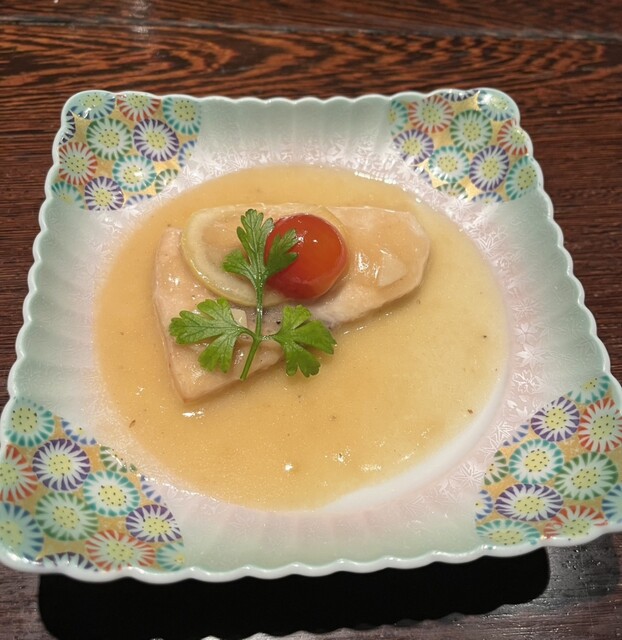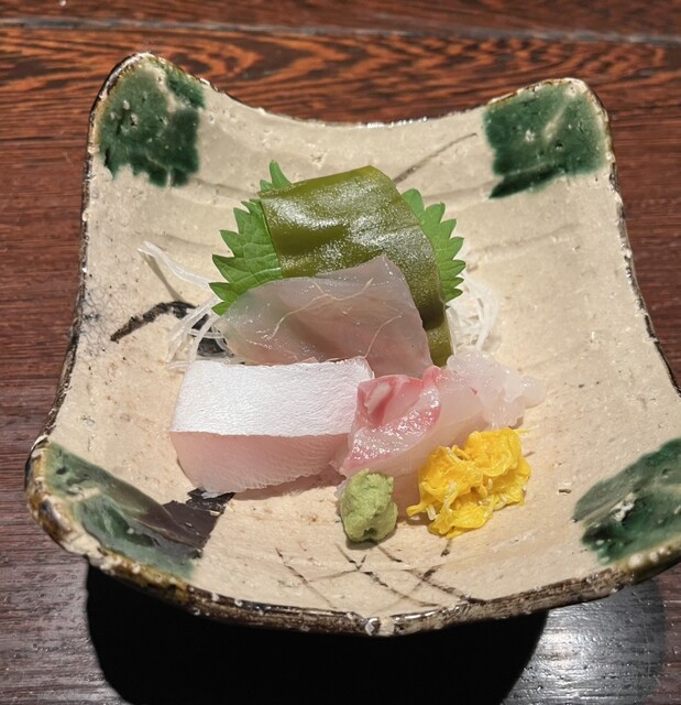内容は、白エビ、カジキマグロの昆布締め、ふくらぎ、鯛であり、富山の地魚を中心に据えた、季節と土地を感じる上質な盛り合わせである。