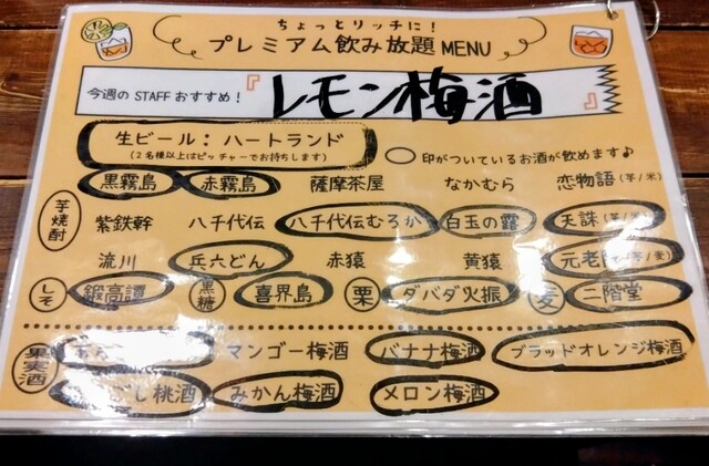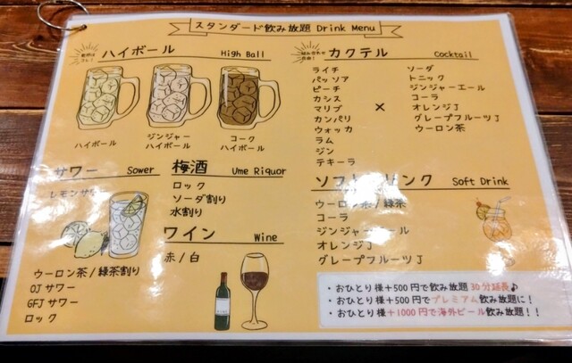 | ドリンク | 焼酎あり、ワインあり、カクテルあり、焼酎にこだわる、ワインにこだわる、カクテルにこだわる |