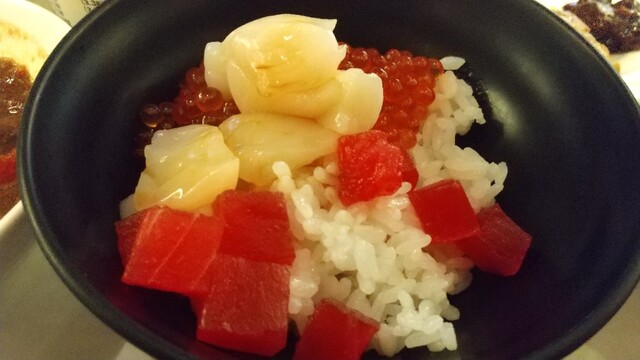 日によって、ネタはかわりますが、まぐろ、ほたて、いくら、サーモン、赤海老の中から2~3種類が登場して、盛り放題の海鮮丼をいただくことができます。