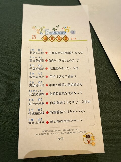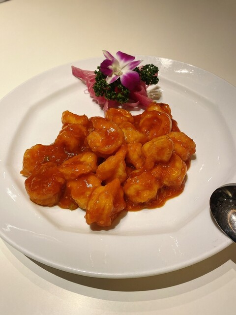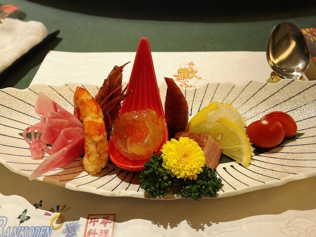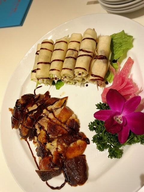 職場で定年退職のお祝いと再雇用ご勇退感謝の会を、こちらのお店でしました。円卓の個室を予約し、気兼ねなく10人で周りを気にすることなく食事することができました。飲み物別の¥5,500のコースを頂きましたが、まず、前菜の盛り付けが1人ずつなのと、その美しさに驚きました。大根の飾り切りが華やかで、前菜からこの後の御料理に期待させる盛り付け。お味ももちろん美味しかったです。フカヒレスープ、大海老のチリソース、肉焼売ともち米焼売、牛肉に胡椒炒め、どれも美味。ここまでは、このくらいのお値段なら食べられるかなぁというラインナップですが、北京ダックが入っているではないですか‼️しかも、巻いてある。素晴らしい‼️その後も、白身魚の豆鼓炒めにチャーハン、杏仁豆腐と本当に至れり尽くせりの豪華ラインナップ。出席された方皆さん喜んで頂きました。