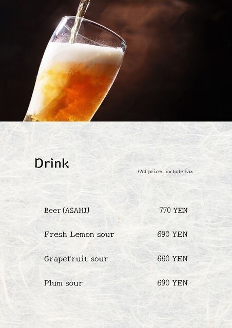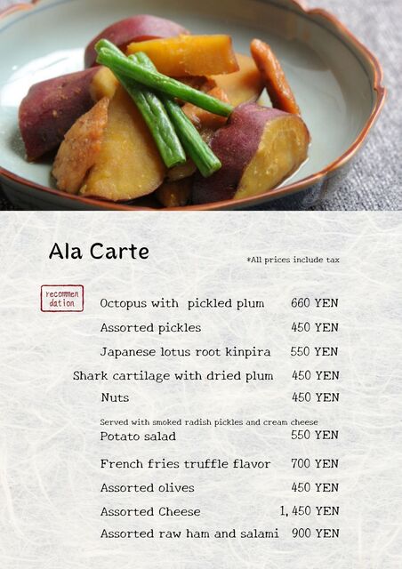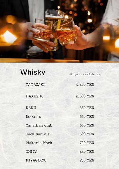 | サービス | 2時間半以上の宴会可、ハッピーアワー、複数言語メニューあり(英語) |