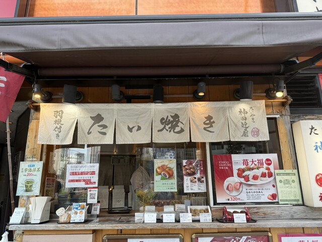当店の看板商品は、元祖・羽根付きたい焼きです。頭パリッと、尻尾はもっちり食感の皮と自家製のとろとろあんこをアツアツのうちに店先でお召し上がり頂けましたら幸いでございます。お持ち帰り用にはかりんとう饅頭他、季節の和菓子(苺大福、草餅、桜餅、みたらし団子、ぷるトロわらび餅)もご用意しております。