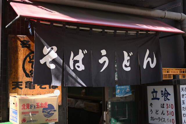 立ち食い蕎麦屋と言っても、もりが得意な店、うどんが得意な店といろいろあります。 ここ天亀の「常連さんは暖かい蕎麦に、好きな天ぷら」をトッピングして注文されます。 稲荷も人気と言うが1/5位の発注度です。 濃いめに見える「ツユ」はしっかりコクがあり、甘辛ではありません。 体調・好み等で薄味を希望される方には「ダシのみ追加」も可能です。 途中で「カルシウムたっぷりの魚粉」を足すと二度おいしい!