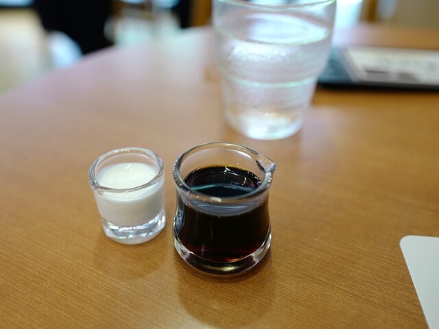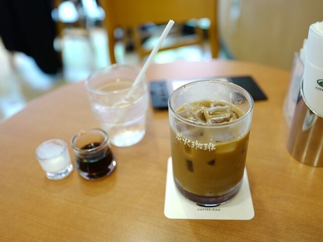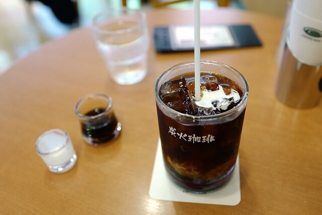 アイスコーヒーを注文したら、大きなグラスにたっぷりと。ミルクもシロップもポーションパックじゃなくて小さな器...