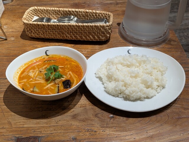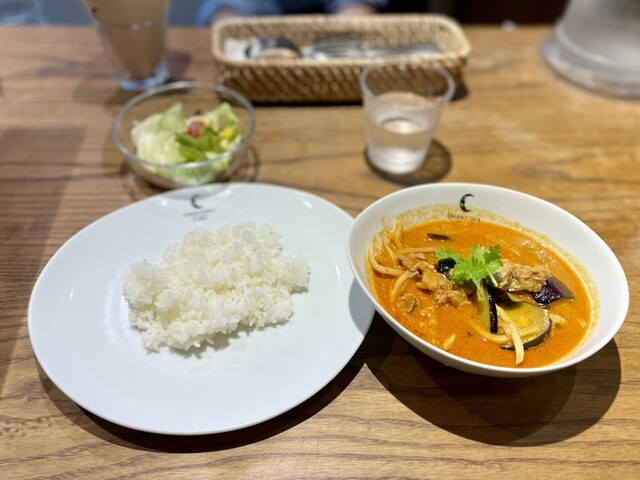 ナス、チキン、タケノコ入りで、ランチにはサラダ付き。