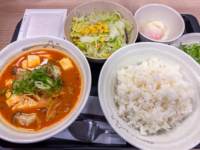 朝食に、期間限定の「牡蠣入り牛豆腐キムチチゲセット」をいただきました。 オプションで「生野菜」と「納豆」も追加。ちなみに、写真のご飯は大盛(料金変わらず)です。 魚介の旨味... 詳細を見る