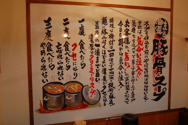 スープを仕込む前にやらなければならないこと。それは「気合い注入!!」 気持ちを込めて丁寧に丁寧に作り上げるスープ。お客様の「旨い!」の声が聞きたくて、 今日も朝から気合い注入! 特殊な機材は一切使わず寸胴一本と技術で勝負! 麺に絡み付くほどよい濃度がクセになる。 最後の一滴まで旨い濃厚でくクリーミーなスープ。 一度食べたらクセになり、 二度食べたら忘れられない、 三度食べたらやめられない。