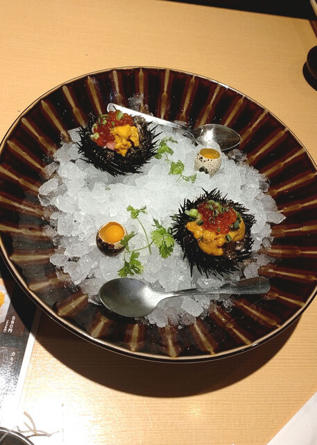 お店のこだわりからの一品。牛タンユッケの上に生雲丹とイクラ。更に鶉の生玉子をかけて頂きます。コリコリした牛タンユッケに生雲丹とイクラが絡みます。加えて鶉の生玉子が加わり、マイルドなコクと旨味が口の中で広がります。正にもてなしの酒盛りの一品。