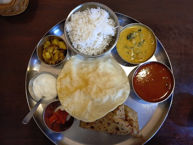 神田駅西口にミシュランガイド掲載の本格インド料理があります。今日はアジア・エスニック百名店「アーンドラ・ダバ」でランチです。線路沿いの雑居ビル2階に店舗があります。店内はスタッフさんも現地の方で異国の雰囲気です。ランチメニューの中から④アーンドラミールス1,350円にしました。カレー2種は日替りの中からマトンカレーとチキンカレーを選びました。チャパティかプーリを訊かれます。全然解らなかったですが...