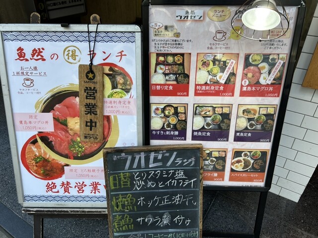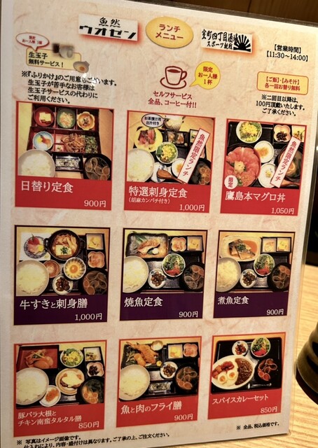 ランチメニューは、日替わり定食、焼き魚定食、煮魚定食、刺身定食などの定食ものと、鷹島本マグロ丼にチキン南蛮、フライ、カレーまでありました。