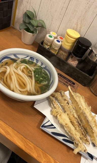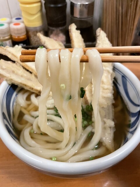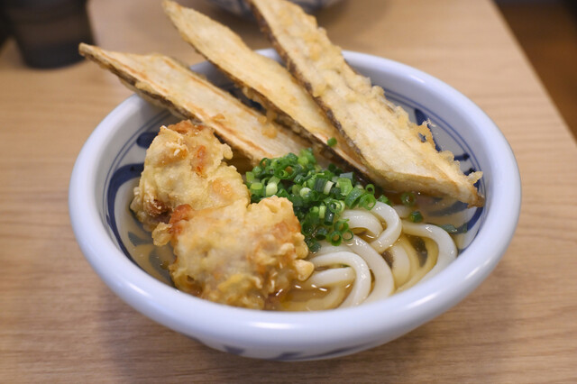 ほどなくして、まずはかけうどんととりちくわ天がと到着。シンプルに麺と小口ネギが美しく、とり天2個が大きくて...