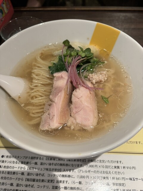 塩生姜らー麺は、スープを一口飲んだ瞬間に生姜の香りと塩の旨味が広がり、さっぱりしつつも深みのある味わいが印象的。生姜のパンチが効いていながらも優しいスープで、飲み進めるごとにどんぶりの底に沈んだ...