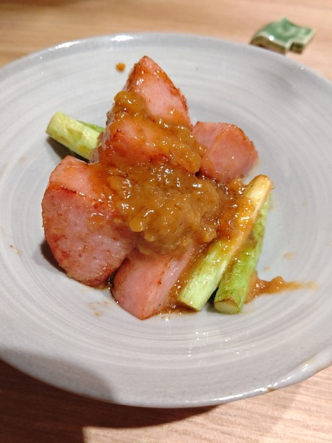 アスパラが添えられて、少しバターも使っているのかそんな風味も感じつつも、もろみ度合の強い、濃い味で、ビールがあっという間になくなり(爆)