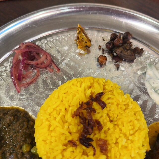 肝心のビリヤニ。皆さんも書かれている通り、大きなお盆に小さなお皿をひっくり返す(口で言うほど格好良くはひっくり返りません...