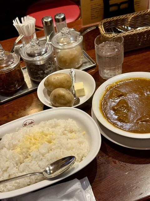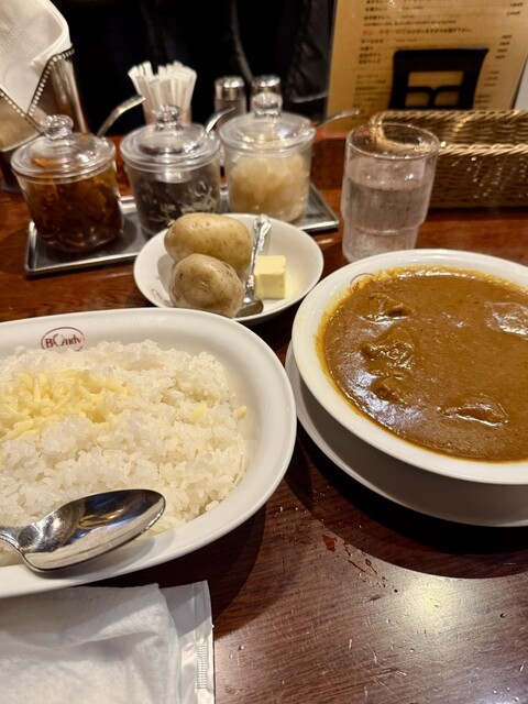 中辛ビーフを注文しました、辛さも程よく欧風カレーの王道ですね!テーブルにはレーズ、福神漬け、らっきょが!こちらも良いアクセントに!ジャガイモは中までホ...