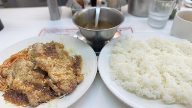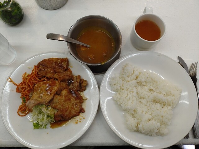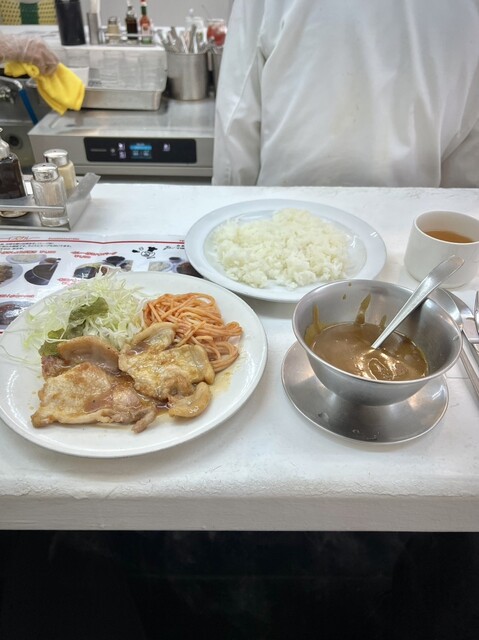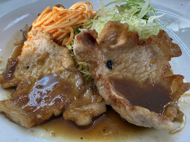 お昼しかやってないお店なので中々行く機会が無かったのですがようやく機会に恵まれました。カレー屋さんの様なんですがハンバーグと生姜焼きも有ります。店内はコの字型のカウターで中におばちゃんが1人厨房に男性1人、ご夫婦なのかな?カウンターに着き迷う事なく生姜焼きをオーダー、そうですコレが目当てだったのですよ^_^結構早く出てきましたね。