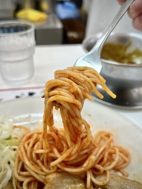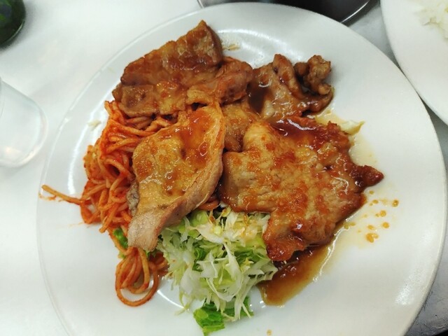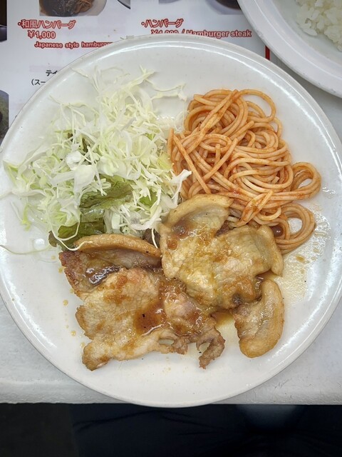 生姜焼き~~~白い丸いお皿にナポリタンと千切りキャベツの付け...