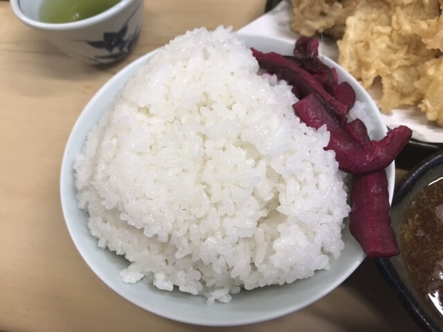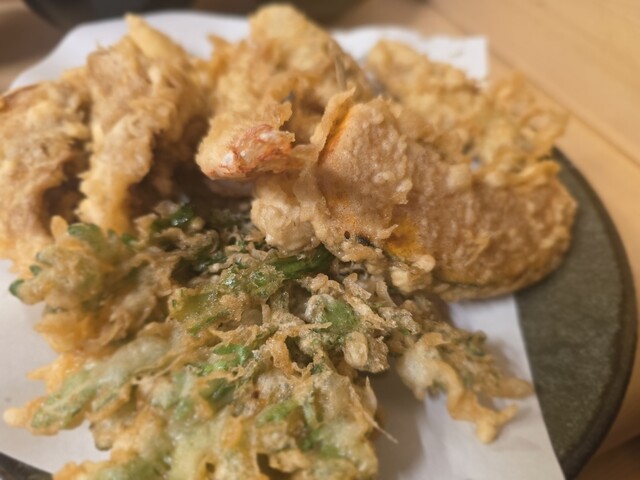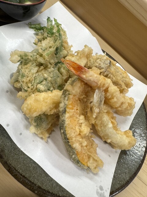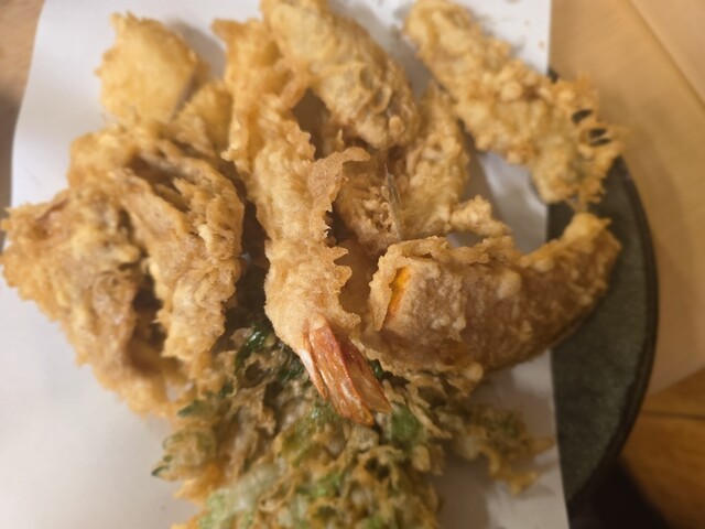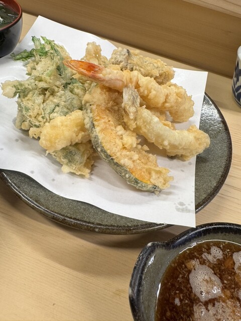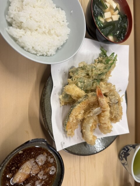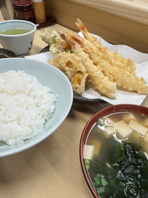 えび定食1200円+まいたけ150円をオーダーしました(2025年7月現在) 老夫婦2人で切り盛りしているお店は、カウンターのみの大きさの店舗、店主が天ぷらを揚げる様子を眺めながら待ちます えび定食は海老4本、海苔、春菊、カボチャにご飯と味噌汁が付きます ご飯は大盛にも出来ますが、並みでもボリ... 詳細を見る