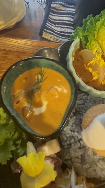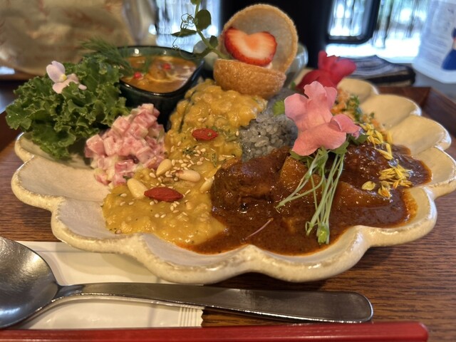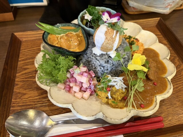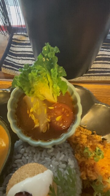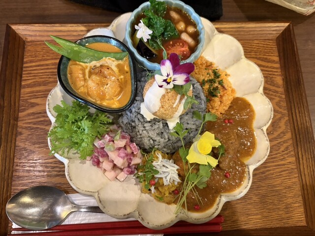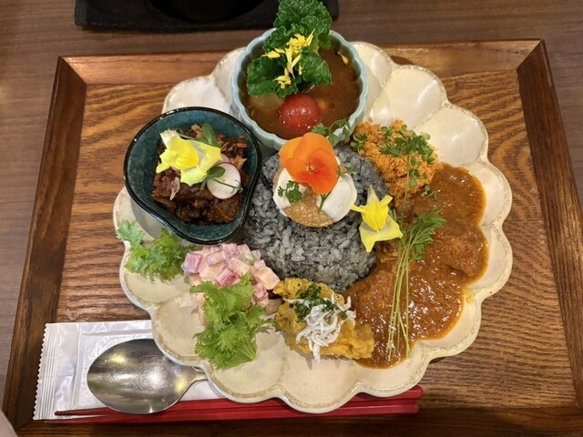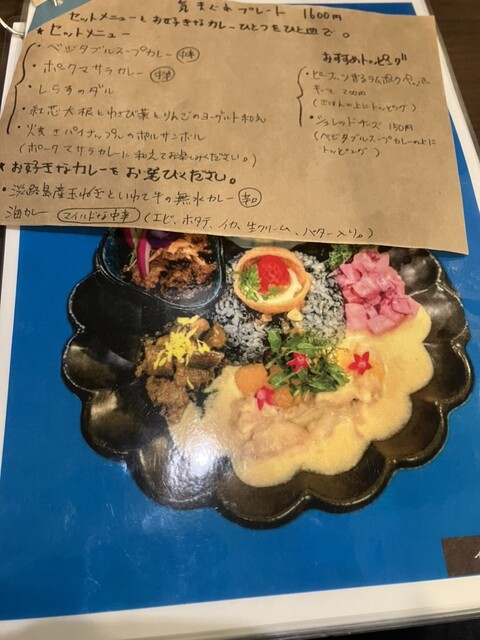 休日12時前に来店。並ばずに入店することが出来た。メニューは、気まぐれプレート(1,600円)にデフォルトで、牛の無水カレーと、海カレーを選択可。海カレーを選択し、トッピングにラムキーマポーク(200...