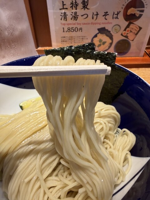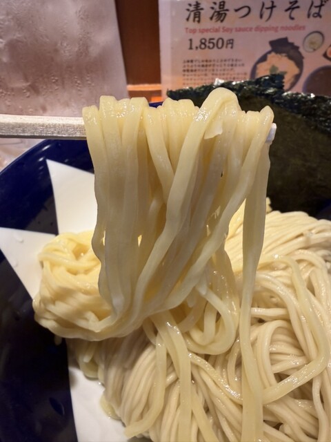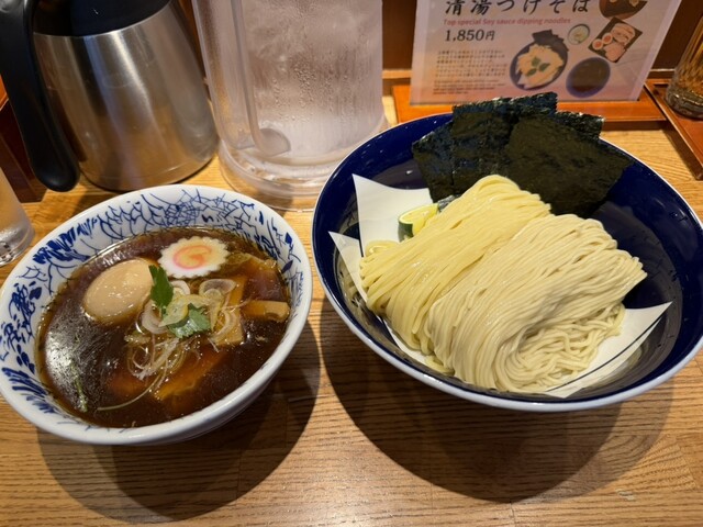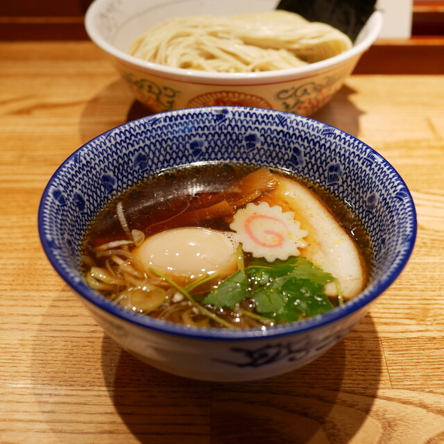 香り高い煮干し清湯スープに細麺と平打ち麺。二種合い盛りで異なるおいしさを味わえるつけそば。