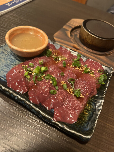レバーは石焼鉄板と共に運ばれてきてゴマだれで