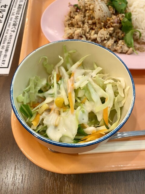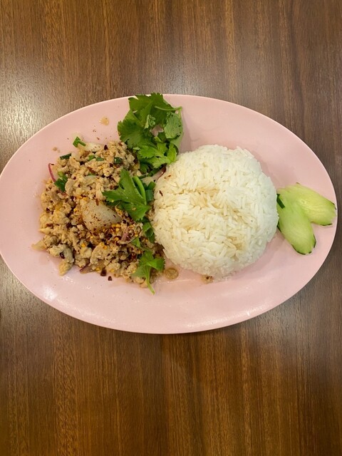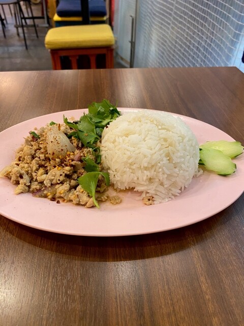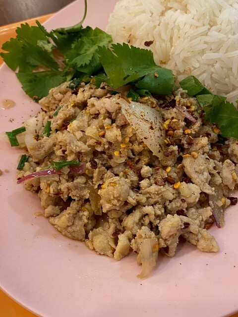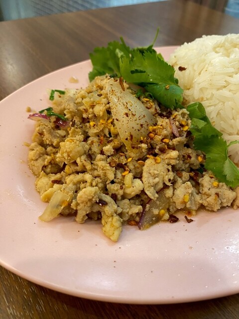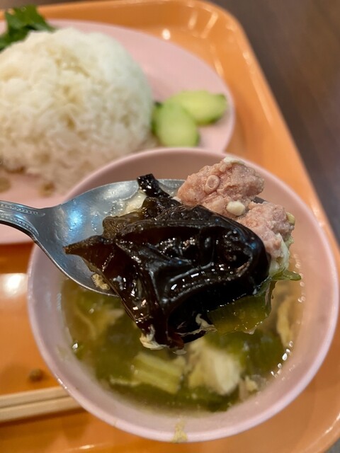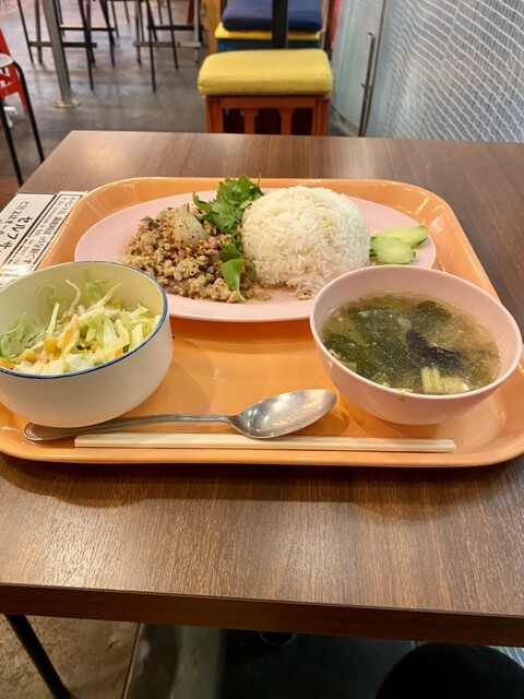 しっかり辛い。でも、ただ刺激的なだけじゃなくて、レモングラスの爽やかさと、香草の奥行きがちゃんとある。スープにはきのこ、パクチー、野菜がごろごろ...