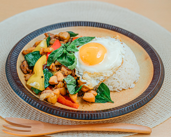 ランチは基本的にカオマンガイ1択、980円。ライスと肉の種類を選べて、さらにソースが選べ、カリフラワーライスなどヘルシー志向の選択肢もあり、健康に気を遣いつつ楽しめるコンセプトは◎。ちなみにガパオライスもあります。