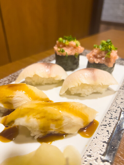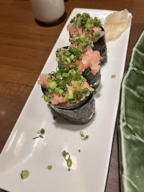 〆に寿司が食べれるなんて、ポイント高し! アラカルトで注文… ◆お通し(おでん・ガンモ) ◆シーザーサラダ ◆炙り明太子 ◆お刺身 ◆焼鳥5種盛り合わせ ◆お任せ... 詳細を見る