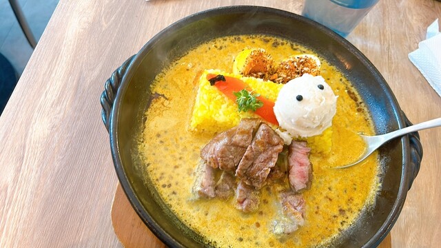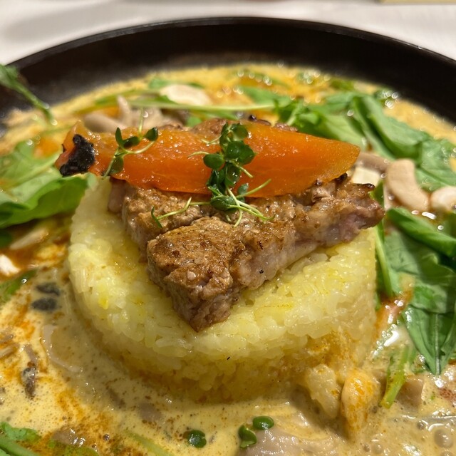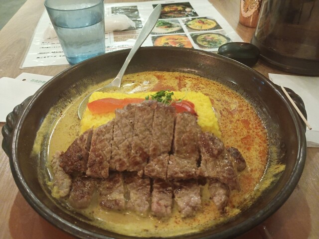 豚肩ロースステーキカレー¥1500を2辛でお願いしました。一回までルーとごはんをおかわりできます。 店内は開放感があって明るいですね。他にもきのこカレーやドライカレー×パクチーな... 詳細を見る