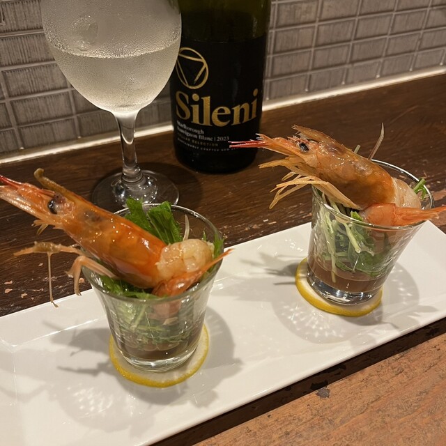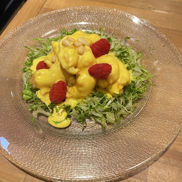 エビのマンゴーマヨネーズは、マンゴーの香りとラズベリーの爽やかな酸味がアクセントになっていて美味しすぎる、、、フルーティーな白ワインと合わせ最高。
