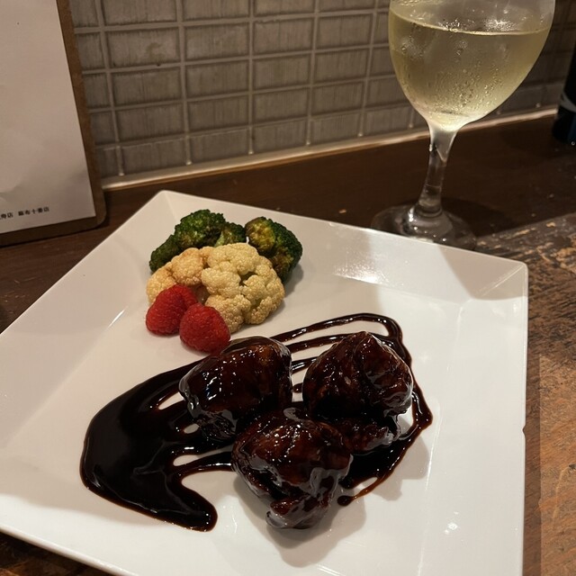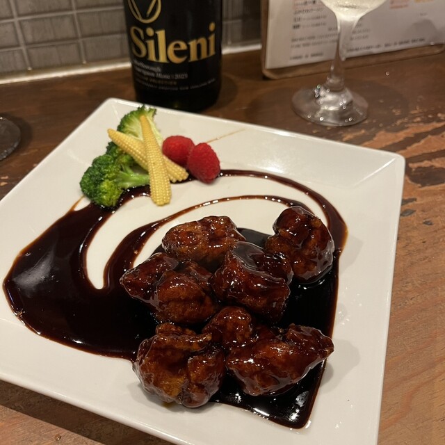 酢豚は大好きなメニュー。バルサミコと黒酢の酸味が程よく、白ワインに良く合う。ラズベリーと一緒に口に運ぶと、酸味とフルーティーな香りが広がる。