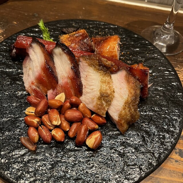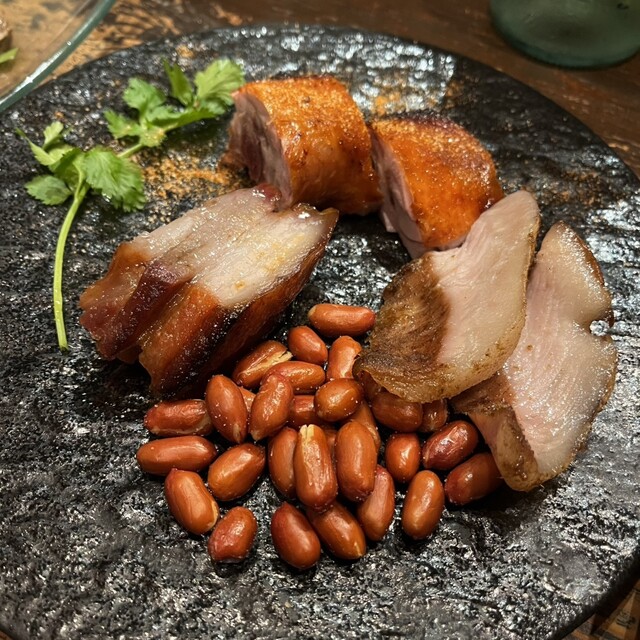 スペアリブの釜焼きチャーシュー、豚トロの香草焼き、骨付き鶏モモ肉のピリ辛釜焼き、どれも本当に美味しくお酒が進む。