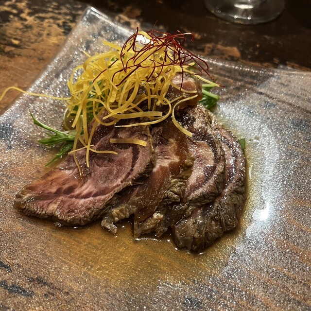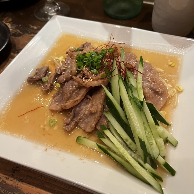 この日のお料理は、焼物盛り合わせ(ハーフ)、中華風冷奴 ピータンソース(ハーフ)、国産豚肉と野菜の海老味噌蒸し、和牛千本筋の香味ソース(ハーフ)、クルミの担々麺(ハーフ)、XО醤炒飯(ハーフ)を注文。