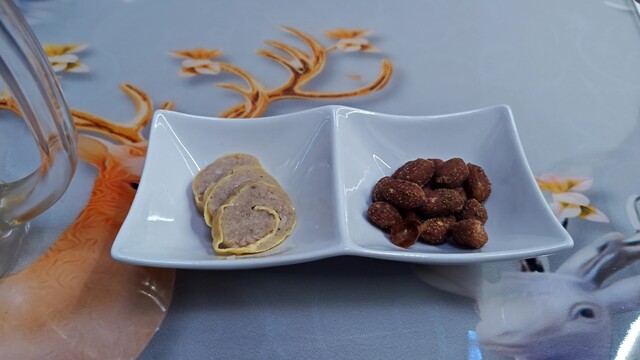 お通しは、揚げピーナッツと中華風の練り物。