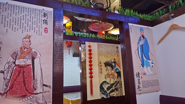 壁には、劉備、諸葛亮、曹操などの絵が飾ってあります。