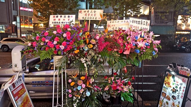 この日、ビルの前の歩道に、開店祝いの花が並んでいたので、