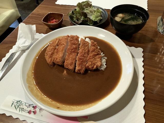 じっくりと時間をかけて作り込んだ自家製カレーということです。それにカツをのせて。別皿で、福神漬け、サラダ、味噌汁が付きます。