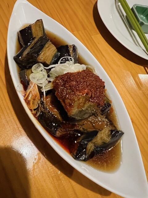 茄子の揚げ浸し 自家製ラー油をかけて (by お店)