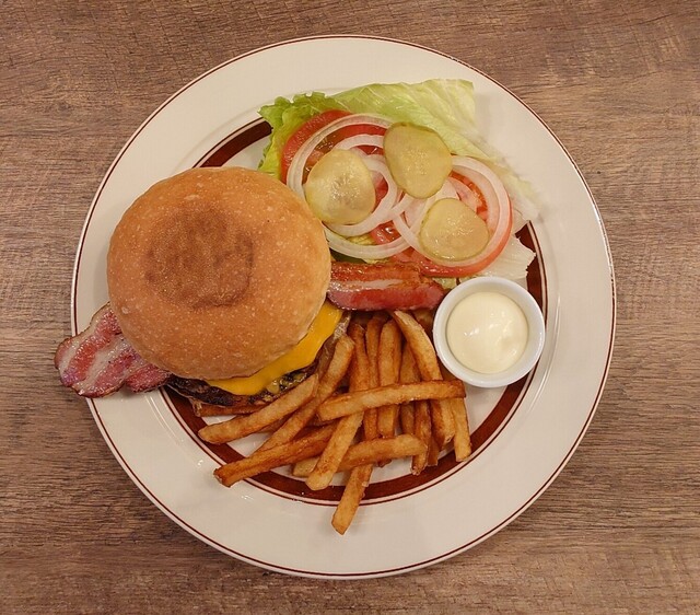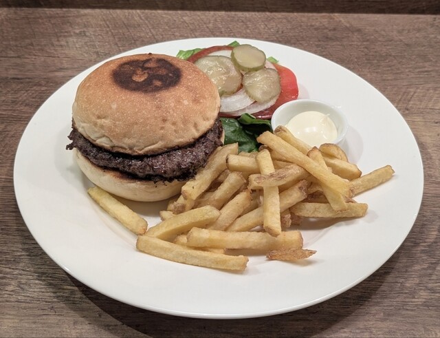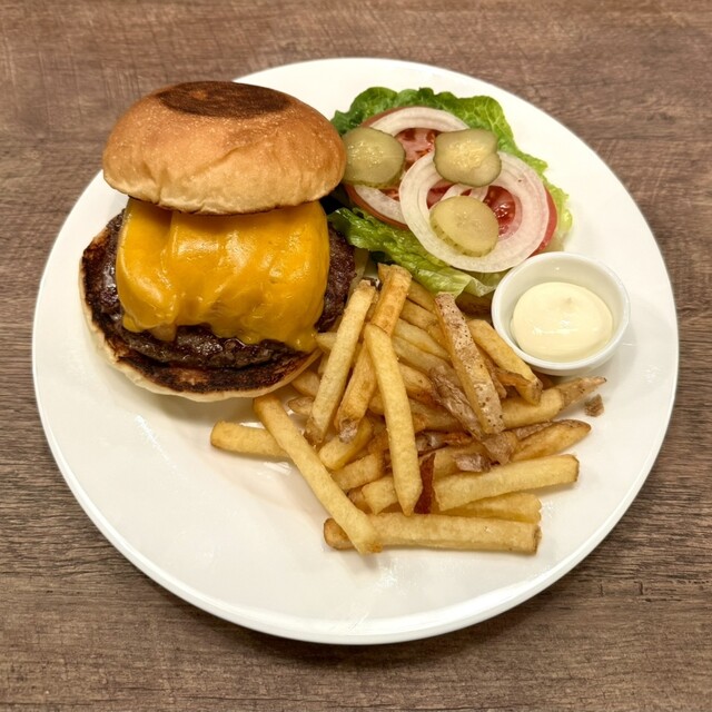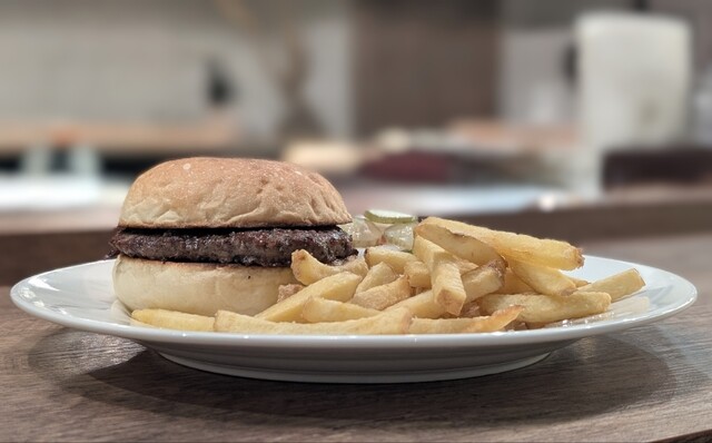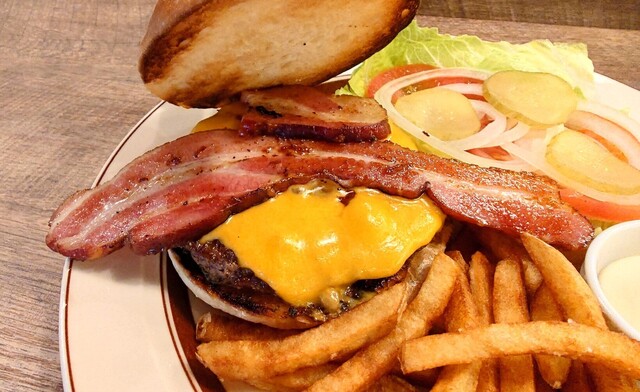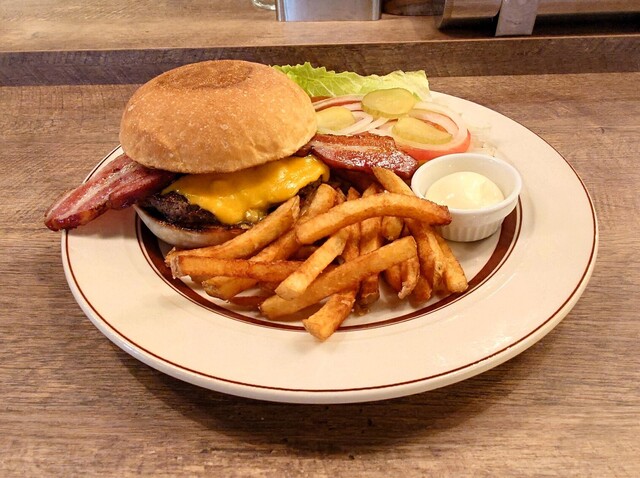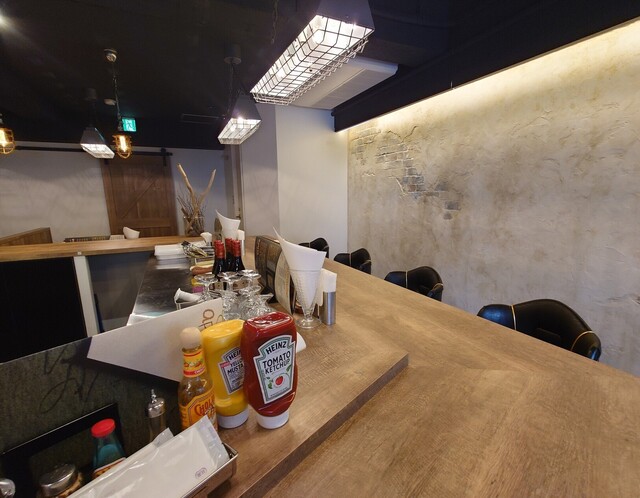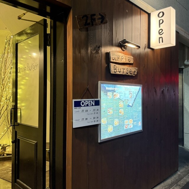 長年、老舗グルメバーガー店で経験を積んだ店主が新たに挑む専門店。オリジナルバンズ、ジューシーなパティ、アップルパイを思わせる仕込みリンゴが織りなす「アップルバーガー」は、ここならではの一品。ランチタイム限定のお得なドリンクセットもおすすめです。アメリカの山小屋を彷彿とさせるウッド調の店内は、オレンジ色の照明が心地よい寛ぎを演出。どこか非日常を感じさせる空間で、心ほどける時間をお過ごしください。
