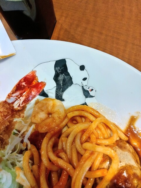 注文から約7分で「パンダプレート」が到着···。パンダのイラストが描かれたお皿(写真あり)の上に、エビフライ、カニクリームコロッケ、ハンバーグが盛りつけられています。まさに、洋食界の “三種の神器 ”!